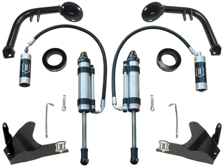 The S2 Secondary Shock System utilizes the factory lower control arms and maintains OE track width while a combination of a billet aluminum shock tower adapters, fabricated shock hoops, and steel skid plates (with incorporated shock mounts) make for a straightforward install with the exceptional build quality you would expect from an ICON Vehicle Dynamics product. The system was designed to eliminate the need for any major alteration of the vehicle’s frame or any other factory suspension components, and the components are 100% removable in case the system is to be installed on another vehicle. The modular design of the S2 kit also allows for standalone installation of the skid plates, which provides the added benefit of protecting the factory lower control arms from potential trail damage that can be experienced while off-road.