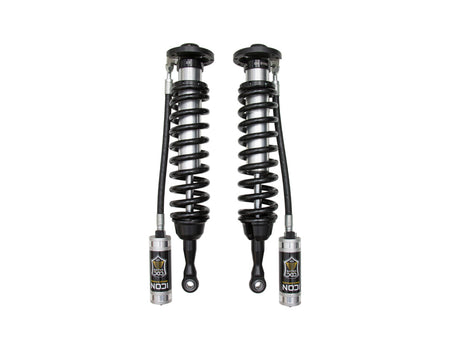The ICON Vehicle Dynamics V.S. Series 2.5” remote reservoir coilover shocks w/ CDCV are an incredible upgrade for the front end of the 2007-2021 Toyota Tundra. ICON’s Vehicle-specific valving provides a sport tuned feel on and off-road while offering 1-3” of lift height adjustability for use of larger, more aggressive wheel and tire combinations. ICON's larger 2.5” shock body and increased piston area over stock components provides improved damping ability and outstanding ride characteristics across varying types of terrain. Remote reservoirs ensure optimum performance by increasing the duration of consistent damping regardless of situation, keeping the shocks at a cooler operating temperature during heavy use. The ICON CDC Valve upgrade is included for those desiring an easy way to tune the ride externally with 10 adjustment settings from soft to hard. When paired with ICON rear 2.0 Aluminum Series or 2.5 Series shocks, vehicle control will be balanced front to rear resulting in the best overall driving experience for your Tundra.